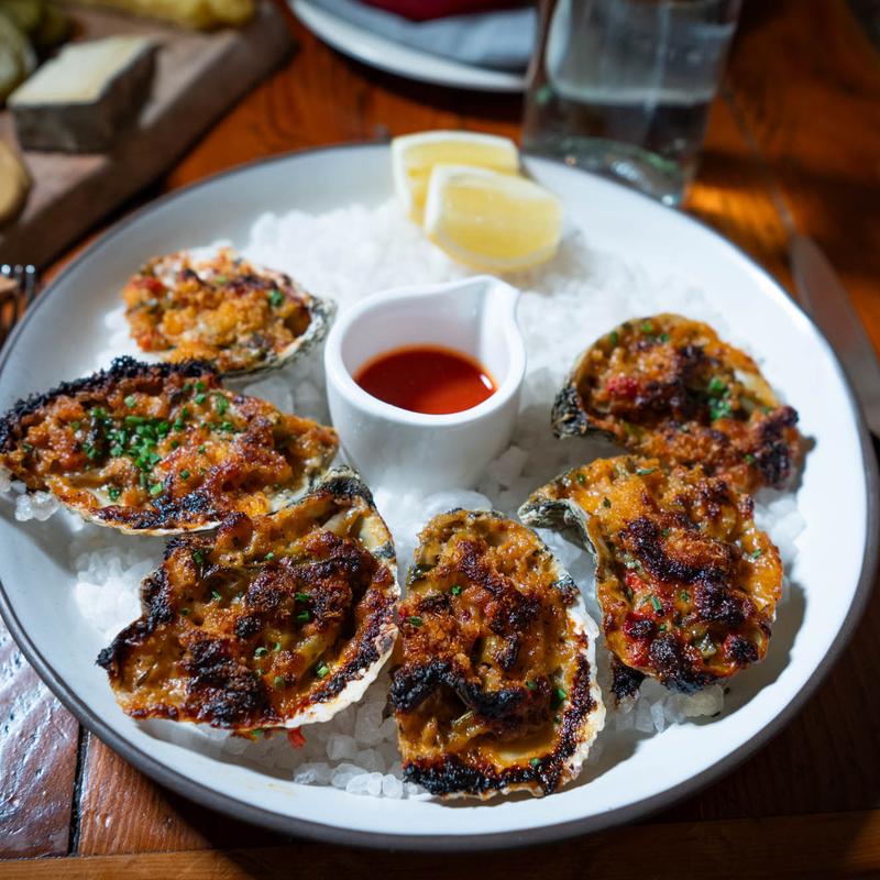 Apple Brandy Beef, Cheerwine BBQ, Dill Pickles, Shallots, Egg Yolk, Cornmeal Battered Onion Rings