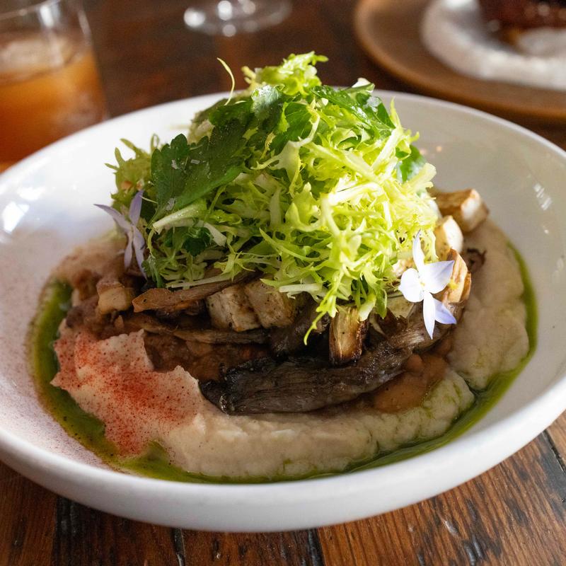 Gigante Beans, AM Sea Island Red Peas + Cream Peas, Celeriac Puree, Leek Oil, Herbs, Lemon-Caper Breadcrumbs